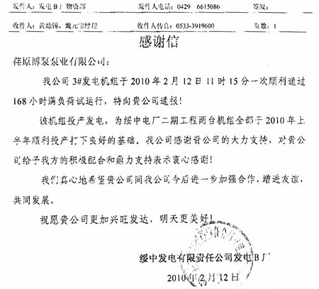 日前,綏中發電有限責任公司發電B廠發來感謝信,通報了我公司供貨的2000VZNM型立式循環水泵順利通過168小時滿負荷試運行, 順利發電。綏中發電有限責任公司發電B廠,為2X1000MW超